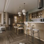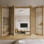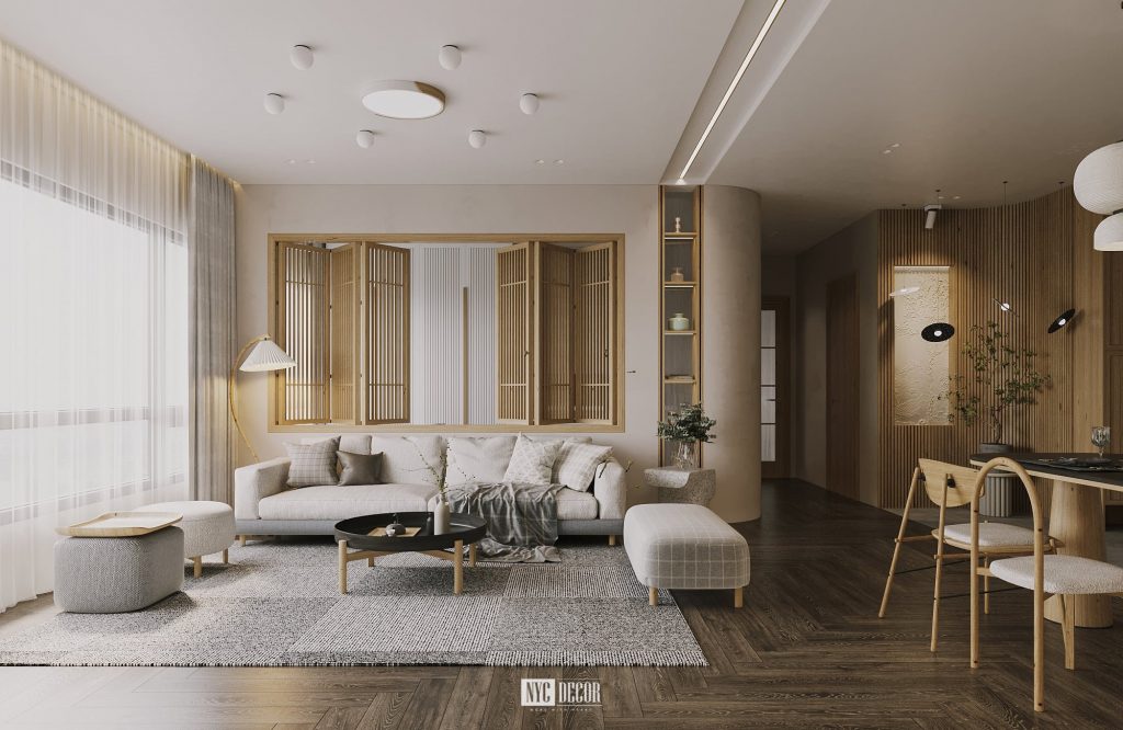 Một không gian sống đem tới cảm giác mọi thứ đều được chậm lại để ta có thể tận hưởng từng giây, từng phút dành cho bản thân và gia đình. Vật liệu gỗ được xuất hiện hầu hết ở mọi nơi trong căn hộ được biến tấu, sáng tạo đúng với tinh thần văn hóa Nhật Bản, thể hiện chất thô mộc, giản dị nhưng cũng rất nổi bật dưới nghệ thuật sử dụng ánh sáng của KTS.